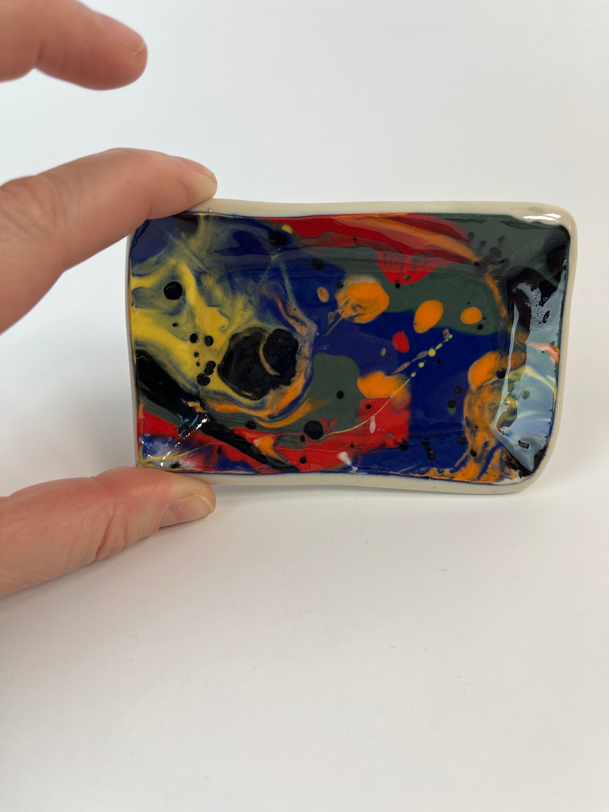 A small porcelain trinket dish made with a “paint pour” method. Cone 10.